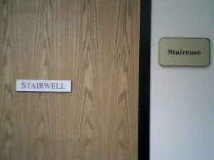 First the sign to the right of the door replaced a paper sign letting people in my office building know where to find the stairs. Apparently this wasn’t enough, because a new sign appeared ON the door.